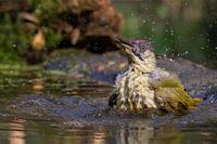 Een groene specht neemt een bad en de waterdruppels en de golven in het water laten de actie zien.