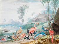 Een groep exotische vogels in een landschap onder palmbomen, een gebouw en bergen daarachter, Johannes Bronckhorst