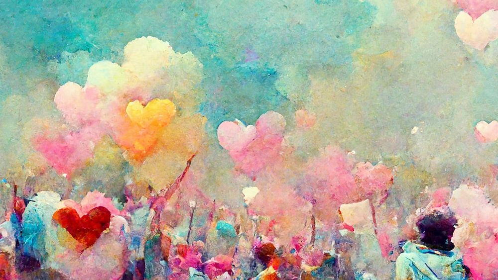 De mensen vieren feest met elkaar en zijn vrolijk. Kleurrijke wolken en harten zweven boven de groep. Het schilderij ziet eruit als een schilderij met waterverf en is een blikvanger in elk huis. Het nodigt uit om te blijven hangen en te ontdekken. Het staat voor liefde, samenhang en hoop.