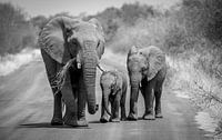 Een groepje olifanten steekt de weg over in het Kruger Park in Zuid-Afrika.