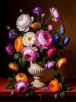 Dit levendige kunstwerk toont een weelderig boeket van diverse bloemen in een klassieke urn tegen een rijke, donkere achtergrond. Het arrangement bestaat uit pioenrozen, margrieten en verschillende andere bloesems in een duizelingwekkende reeks kleuren, van zacht wit en roze tot fel oranje, paars en dieprood, wat een gevoel van weelde en natuurlijke schoonheid creëert. Verschillende individuele bloemen zijn ook sierlijk verspreid op het rode oppervlak onder de vaas.