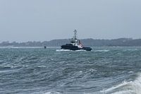 Een grote, stoere sleepboot vecht zich een weg door de storm op de Nieuwe Waterweg. De boeg rijst krachtig op uit de hoge golven, schuimkoppen slaan tegen het staal. De wind giert over het dek, regen striemt langs de opbouw. Tussen de pieren van Hoek van Holland en de Maasvlakte trotseert de bemanning de ruwe zee. Met vakmanschap en vastberadenheid begeleiden ze een vrachtschip veilig naar de haven van Rotterdam — waar beschutting en rust wachten na de woeste tocht.