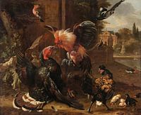 Een haan en een kalkoen vechten, Melchior d'Hondecoeter (1680)