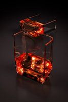 Een gehalveerd whiskyglas dat in twee delen staat of ligt. 3D rendering.