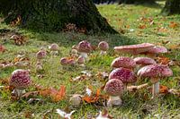 Geweldig om te zien hoe de vliegenzwam in een cirkel groeit, dit noemen we een heksenkring. Het is een rode paddenstoel met witte stippen.