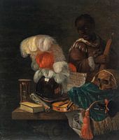 Een helm versierd met struisvogelveren, een viool, een trompet, een schedel en andere voorwerpen op een tafel met een jonge moor in de buurt, Juriaen van Streeck
