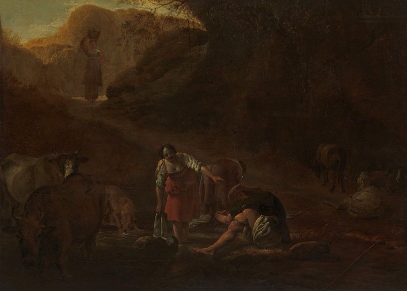 Koop Een herder en wasvrouwen bij een bron, Pieter Bodding van Laer als reproductie geprint op canvas, aluminium dibond, (ingelijste) fotoprint, behang en ArtFrame. Voor jou op maat geprint in Fine-Art kwaliteit.