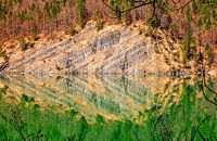Een rotswand wordt weerspiegeld in de herfstkleuren in het Wiestal-stuwmeer