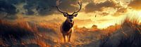 Dit indrukwekkende beeld toont een hert dat recht in de camera kijkt, omringd door hoge, goudkleurige duinen en gras in een schemerig landschap. De lucht is gevuld met vogels die over de horizon vliegen, wat een extra laag dynamiek en diepte toevoegt aan deze al betoverende scène. Het licht van de ondergaande zon schept een bijzondere sfeer, waarin het contrast tussen het warme gras en de donkere lucht prachtig wordt vastgelegd. Een ideale wanddecoratie voor diegenen die houden van krachtige natuurbeelden en mystieke tinten in hun interieur.