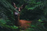 Tijdens een wandeling in het stadsbos zagen mijn man en ik ineens dit hert in de struiken vlak naast het pad. Het keek ons een hele tijd zo aan en stelde ons in staat om mooie foto's te maken, totdat er plotseling fietsers voorbij kwamen en het verschrikt verdween in het donkere bos. De amberkleurige vacht steekt prachtig af in contrast met de weelderige, donkergroene varen. De rustige, grote, zwarte ogen blijven me fascineren. Deze ogen kunnen ook de blikvanger in uw kamer zijn.