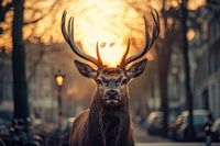 Over ‘Een hert staat midden op een drukke straat in een gewone woonwijk’ van Digitale Schilderijen