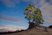 Een hoge kaap en een oude boom met wortels in het zand, nachtlandschap