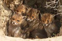 Vier jonge vossen bij de ingang van hun hol. Het past allemaal maar net. Het is wat dringen maar ze passen er nog allemaal in.