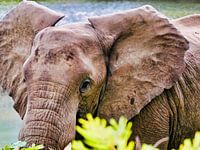 De focus ligt op de imposante kop van de olifant, die wordt gekenmerkt door een mengeling van gratie en grandeur. Zijn enorme oren steken uit als vleugels, vangen het zonlicht en benadrukken het karakteristieke silhouet van het dier. De textuur van de grijze huid van de olifant reflecteert het zonlicht en lijkt op een levend pantser dat zijn lichaam beschermt.
