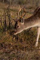 Hier zie je een jong hert dat opzoek is naar voedsel ins de Amsterdamse Waterleidingduinen in Zandvoort.