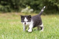 Een jong katje loopt voor het eerst over gras. Doet dat heel voorzichtig omdat ze aan de grassprietjes moet wennen.