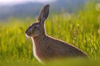 Een jonge haas zit in een groene weide op een zonnige zomerochtend