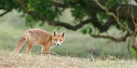Een vossen welp in het duinlandschap van Nederland. Kijkend naar de fotograaf en met een fraaie achtergrond van de bomen in het duin