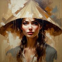 Een jonge vrouw.De vrouw draagt een lichtbeige kegelvormige hoed, die doet denken aan een traditioneel Aziatisch kapsel. Haar haar is lang, donkerbruin en in twee vlechten gestileerd, die over haar rug naar beneden vallen. De totale compositie is een portretstijl, die een gevoel van roest en introspectie uitstraalt. De stijl en sfeer van het beeld doen denken aan klassieke olieverfschilderkunst en tonen een sterk gevoel van realisme gecombineerd met artistieke expressie.