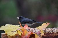 Een junco vogel heeft de tuin feeder in de herfst, Sainte-Apolline, Québec, Canada
