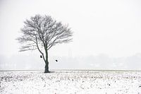 Een kale boom in de mist met twee kraaien en een dun laagje sneeuw.