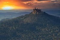 De foto van kasteel Hohenzollern bij zonsondergang is een adembenemend schouwspel van licht en schaduw. Het majestueuze kasteel troont op een beboste heuvel, omringd door een zachte schemering die de lucht baadt in warme tinten oranje, roze en paars. De ondergaande zon werpt haar laatste stralen op de kantelen en torens van het kasteel,…