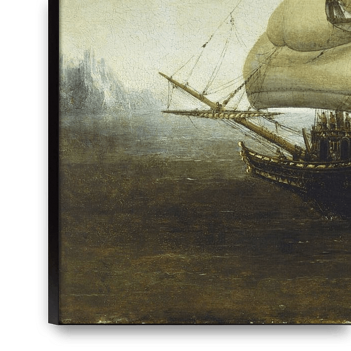 Dit schilderij toont een Nederlands schip op rustig water. Het schip vaart door een kanaal en sleept een boot. Het dek zit vol met figuren die allemaal naar de boeg van het schip kijken. Het schip is afgebeeld in havenboogaanzicht, alsof het op het punt staat om langs de toeschouwer te varen en het minutieus geobserveerde drukke leven aan dek weergeeft. Hij voert de Nederlandse vlag van de grootmoeder en een rode vlag met een apparaat in goud op het achterschip. Het uitzicht strekt zich uit tot aan de horizon, doordrongen van licht dat door de dunne wolkenlaag schijnt. In de verte wordt het tafereel aan weerszijden geflankeerd door bergachtige oevers, bekroond door een groot middeleeuws kasteel aan de rechterkant. Hoewel de hoge rotsen, bekroond door een kasteel, niet bedoeld zijn om topografisch correct te zijn, zijn ze een motief dat in de Vlaamse landschapskunst wordt gebruikt en dat Vroom in zijn marien werk heeft overgenomen.