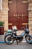 Een kat of een poes zit op een oude motor, met een helm hangend over het voorlicht. Op de achtergrond is een typische Marokkaanse deur zichtbaar. Deze foto is gemaakt in Essauira, Marokko. Stadsfotografie en reisfotografie.