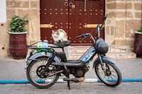 Een kat zit op een oude, vintage motor, met een helm hangend over het voorlicht. Op de achtergrond is een typische Marokkaanse deur zichtbaar. Deze foto is gemaakt in Essauira, Marokko.