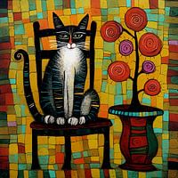 In dit levendige schilderij zit een kat gehoorzaam op een stoel, zijn blik gefixeerd op een ongezien schouwspel. De scène baadt in levendig blauw, gedempt oranje en rijk paars, waardoor een visueel opvallende compositie ontstaat die de aandacht van de kijker trekt.