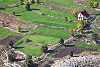 Een klein huisje met een rood dak tussen de smaragdgroene alpenweiden en stenen ver beneden, een symbool van eenzaamheid van rust en eenheid met de natuur.