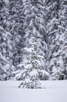 Het bos is met een dikke laag sneeuw bedekt. Op een kleine lichting steekt een kleine spar nog net boven de sneeuw uit.