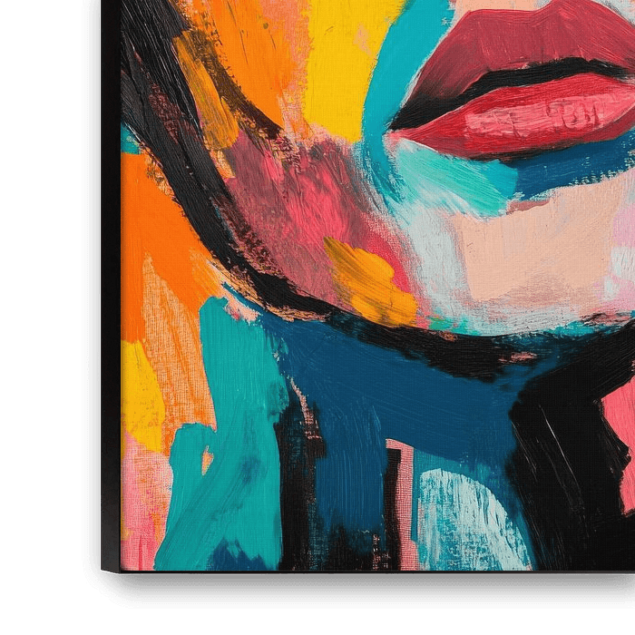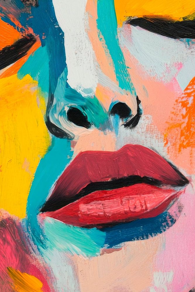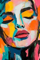De foto toont een indrukwekkend portret van een vrouw, gevangen in levendige, sterke kleuren. De ogen zijn zachtjes gesloten, wat een kalme uitstraling geeft. De felle gele en oranje tinten die het gezicht omlijsten zijn opvallend, terwijl de rozige lippen en contrasterende achtergrond de dynamiek van het kunstwerk versterken.