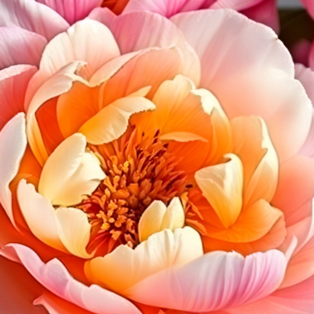 Een bouquet bloemen in macro close up van zacht roze wit licht oranje pioen rozen met lichtinval.