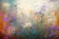Een bloemenzee van margrieten en paarse bloesems danst in een nevel van pastelkleuren. Het schilderij ademt zachtheid en betovert met een bijna sprookjesachtige gloed.