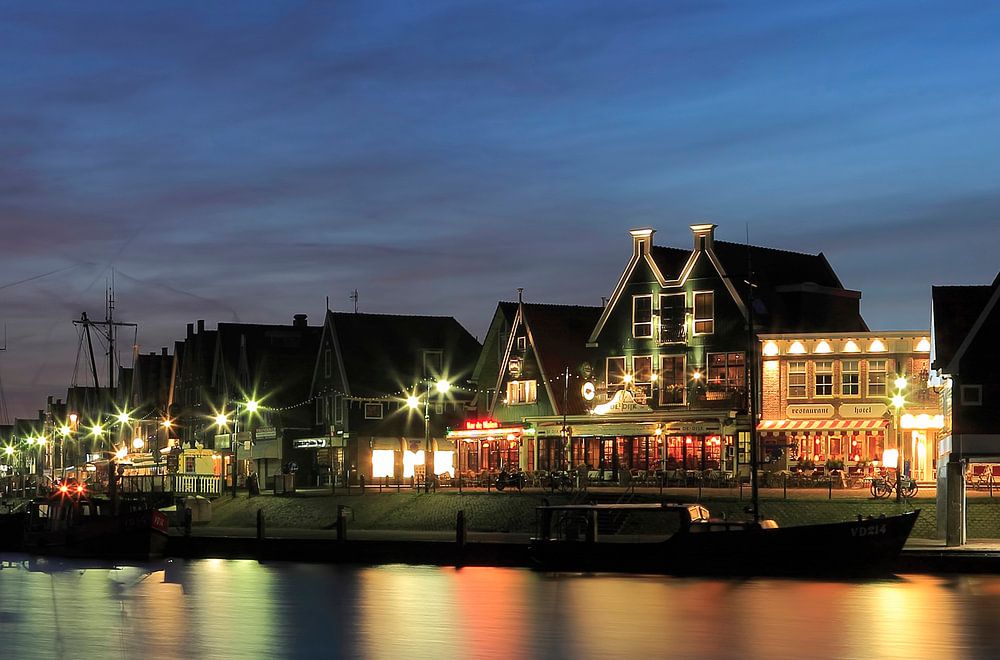 Een in het zogenaamde blauwe uurtje genomen foto waarin een deel van de haven van Volendam in beeld is gebracht