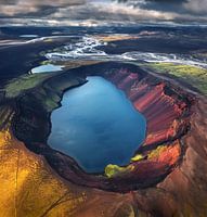 Deze kleurrijke krater kun je vinden in de hooglanden van Ijsland. De foto is gemaakt met een drone en bevat meerdere foto's die aan elkaar zijn geplakt om een verticale panorama te creëren