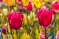 Dit veld stond vol met zeer veel verschillende soorten kleurrijke tulpen. Alle tulpen staan mooi in bloei op deze zonnige dag.
