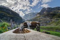 Een koe (stier) drinkt bij een almhut in het Berner Oberland.