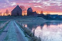De zon komt op achter de oude kerk van Ezinge (provincie Groningen) op een koude ochtend. Het pad richting de kerk slaat wit uit door de rijp.