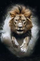 Een krachtige leeuw sprint door een wolk van opwaaiend stof, zijn spieren gespannen, zijn blik vastberaden. Het stof wervelt om hem heen, alsof hij een spoor van energie achterlaat. Zijn manen dansen in de lucht, de klauwen grijpen stevig in de grond. De sfeer is vol beweging en kracht, het beeld lijkt haast tot leven te komen. De kleuren van de leeuw en het stof mengen zich in een dynamisch contrast van aarde en goud. Een intrigerend tafereel dat de wilde natuur en de ongetemde kracht van dit dier perfect weergeeft, een echte blikvanger in iedere ruimte.