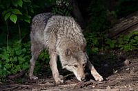 Over ‘Een krachtige wolf (vrouwelijke wolf) besnuffelt de grond op een jacht, de blik van een wolf en een ’ van Michael Semenov