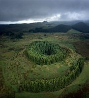 Deze krater vol bomen is gemaakt op Ilha Terceira, Azoren, Portugal.