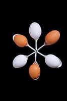 Deze foto bevat witte en bruine kippeneieren gelegd op een witte amuselepel en gepresenteerd in een kring op een zwarte achtergrond.