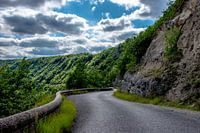 Een lege, bochtige weg tegen een berg aan gelegd in Zuid-Frankrijk, omringd door een groene bergwand en met warme zomerwolken erboven.