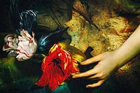 Een antieke kruik met tulpen en een hand die de tulpen streelt. De kleuren met vele gouden tinten geeft dit schilderachtige werk, een zogenaamde nieuwe meester, een warme uitstraling alsof het uit de Gouden Eeuw stamt.