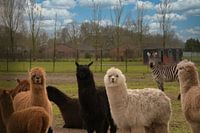 Alpaca's en een zebra die allen kijken vanuit hun weiland. Een plaatje vol met de kleuren bruin wit en zwart wit en de blauwe lucht op de achtergrond. Hier raak je niet op uitgekeken.