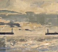 De twee vuurtorens op de havenpieren van Dover (UK) markeren de poort naar het zeegat richting het Continent. Een prachtige impressie van Nop Briex.