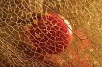 "Een lampionnetje (Physalis) in het "gouden" warme licht" is een macrofoto van een klein stukje van een lampionnetje van de Lampionplant (Physalis). In het midden van de foto zie je vaag op de achtergrond de oranje bes, die zich in de lampion bevindt. De lampion zelf is grotendeels vergaan, Je ziet slechts nog de structuur van de nerven. Hierop is in deze foto de focus gelegd.