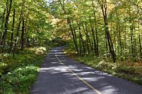 Een landweg doorkruist een esdoornbos, Québec, Canada